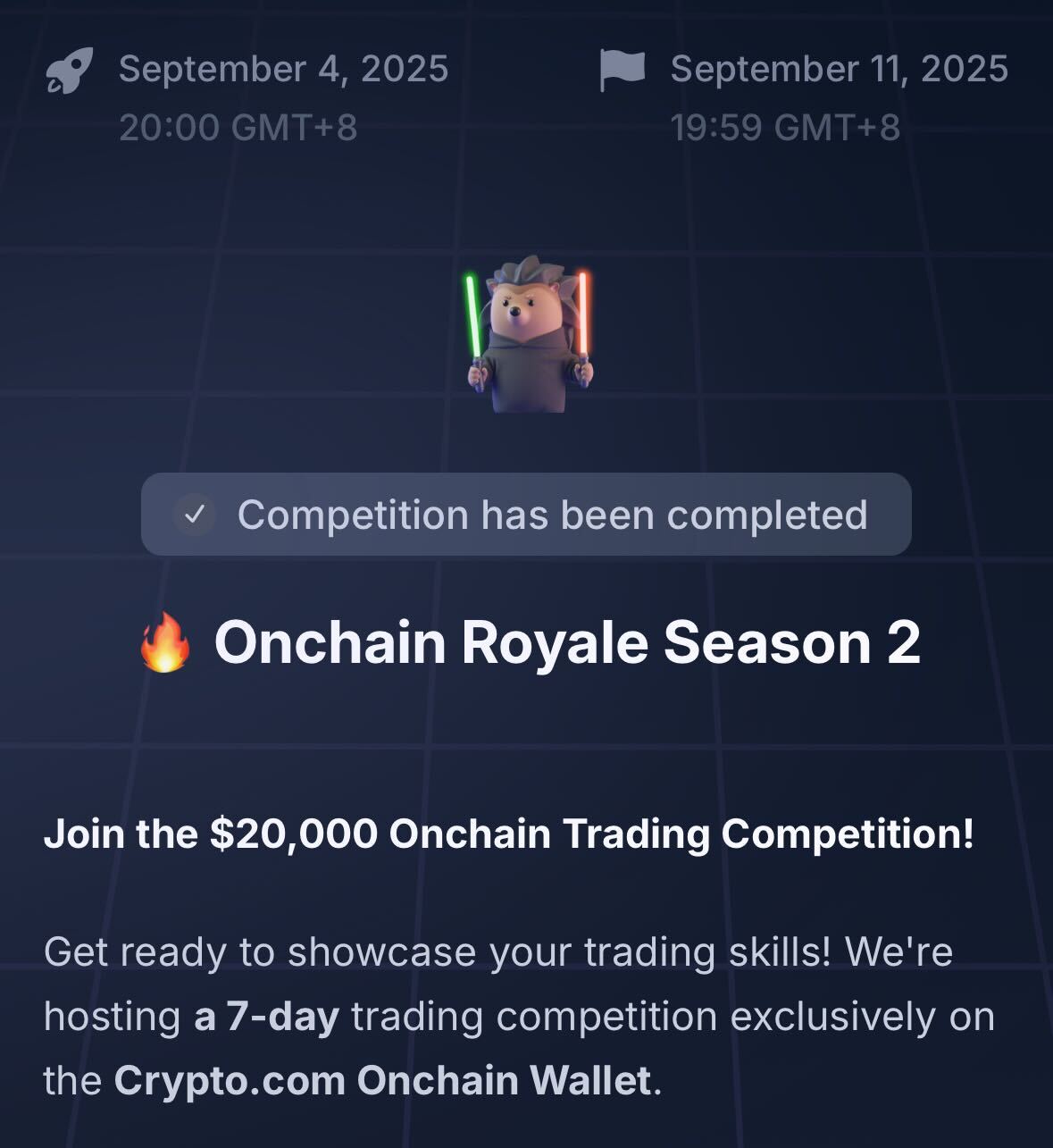 Following the success of the first season, dYdX and Crypto.com once again joined forces to host the "Onchain Royale Season 2" trading competition. Held from September 4 to September 11, 2025, this 7-day sprint offered a total prize pool of 20,000 USDC and was exclusively available to users of the Crypto.com Onchain Wallet, drawing the attention of many traders.